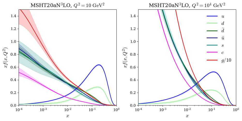Parton Distribution Functions (PDFs) at the highest known order – approximate N3LO (world-first) describing the longitudinal momentum dependence of the partons (quarks and gluons) in the proton and how this changes with energy. Reproduced from https://arxiv.org/abs/2207.04739.
