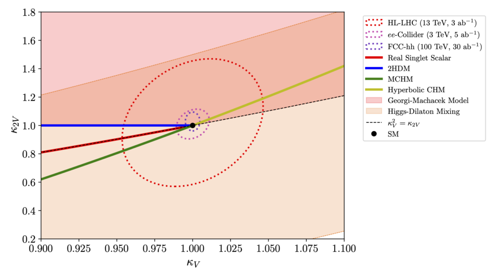 An example of how EFT-based measurements can inform specific scenarios of physics beyond the Standard Model, ranging from extensions of the scalar sector (such as singlet or two-Higgs-doublet, 2HDM, models), through strongly interacting composite Higgs models (CHMs), to exotic Higgs couplings that resemble dilatons — particles associated with spontaneously broken conformal symmetry. Reproduced from https://arxiv.org/abs/2307.14809.